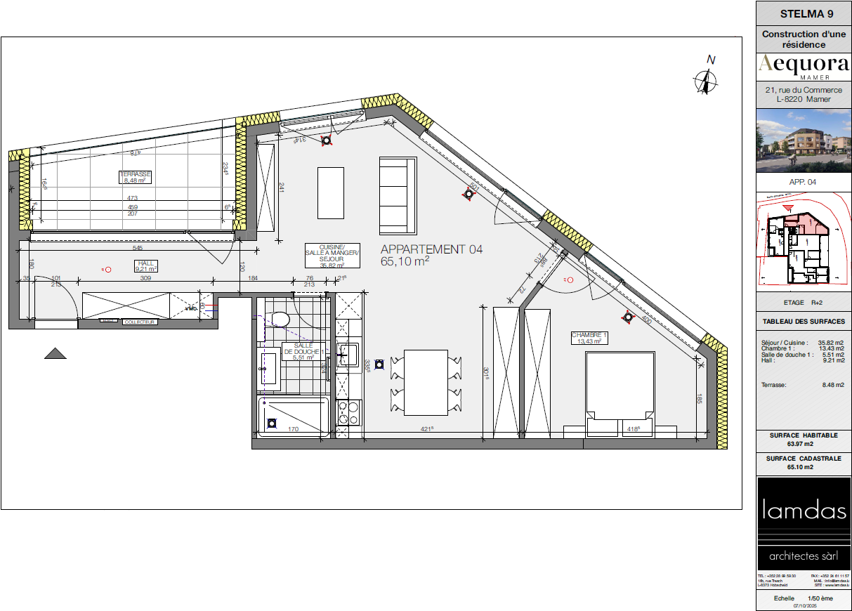 L’appartement se compose d’une entrée donnant sur la terrasse avec un grand débarras. Un couloir dessert une salle de bain avec WC, puis nous pénétrons dans la pièce de vie avec cuisine et salon.
